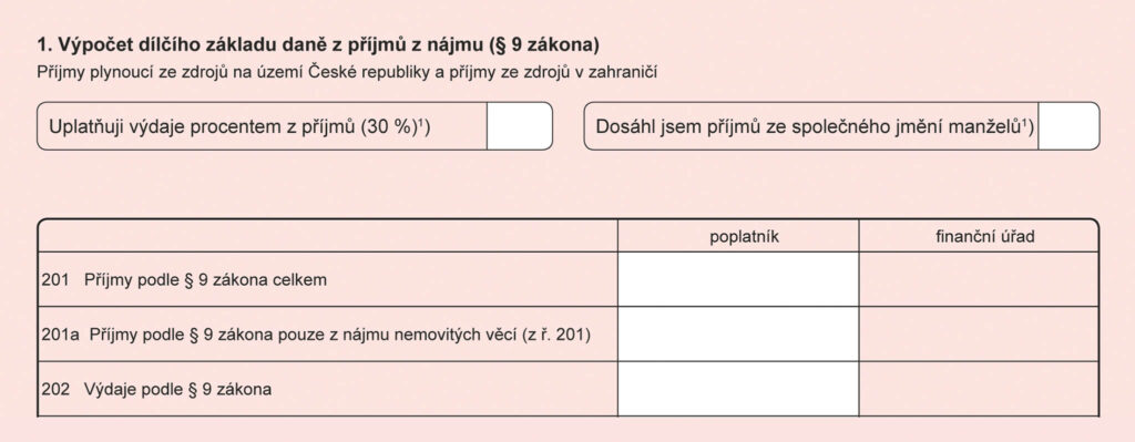 V tomto případě jste plátcem daně z příjmů podle progresivní sazby (15 % nebo 23 %) a můžete uplatňovat všechny prokazatelné náklady. Pokud pronajímáte jen příležitostně, například jeden byt rodině nebo známým, použije se § 8, kde se vyměřuje daň z rozdílu mezi příjmy a náklady (případně paušálně 30 % nájemného, pokud neúčtujete kon
