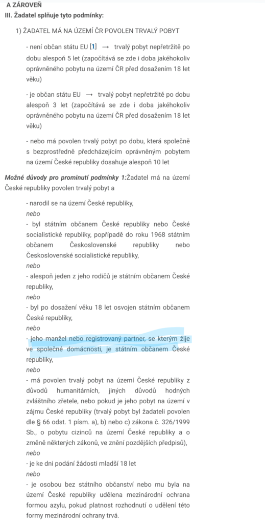Výjimku z desetiletého požadavku mají například osoby, které jsou v manželství s českým občanem po dobu alespoň šesti let, nebo osoby, které se významně zasloužily o republiku. Žádost se podává krajskému úřadu a rozhodnutí vydává prezident republiky.